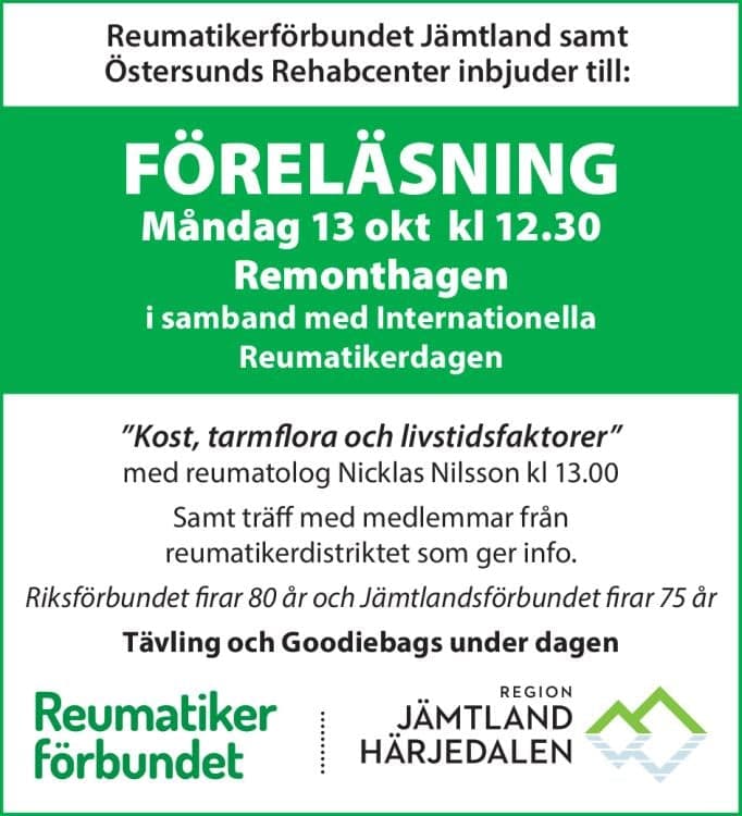 Reumatikerförbundet fyller 80 år och Reumatikerdistriktet 75 år, det ska firas med Föreläsning av Reumatolog Nicklas Nilsson om kost och livsstil, samt Johan Bergman berättar om Reumatikerförbundets nya projekt ”Mitt i livet”.